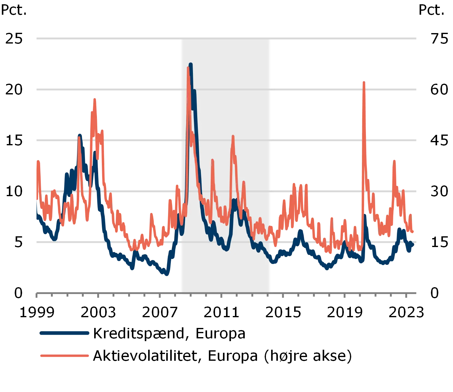 I denne kategori indgår markedsindikatorer med høj frekvens, da vendinger på de finansielle markeder hurtigt viser sig i data. I perioder, hvor målte risici er lave, er der højere risiko for, at systemiske risici opbygges.[1] Det sker, hvis optimismen i et opsving bliver til generel overoptimisme (risikoillusion), og/eller der opstår generel øget risikovillighed. Det skete fx i årene op til finanskrisen, hvor der var stor optimisme og høj villighed til at foretage risikofyldte dispositioner. I den periode var volatilitet og risikopræmier lave, som afspejlet i et meget lavt niveau af den finansielle stressindikator, jf. figur A.2.