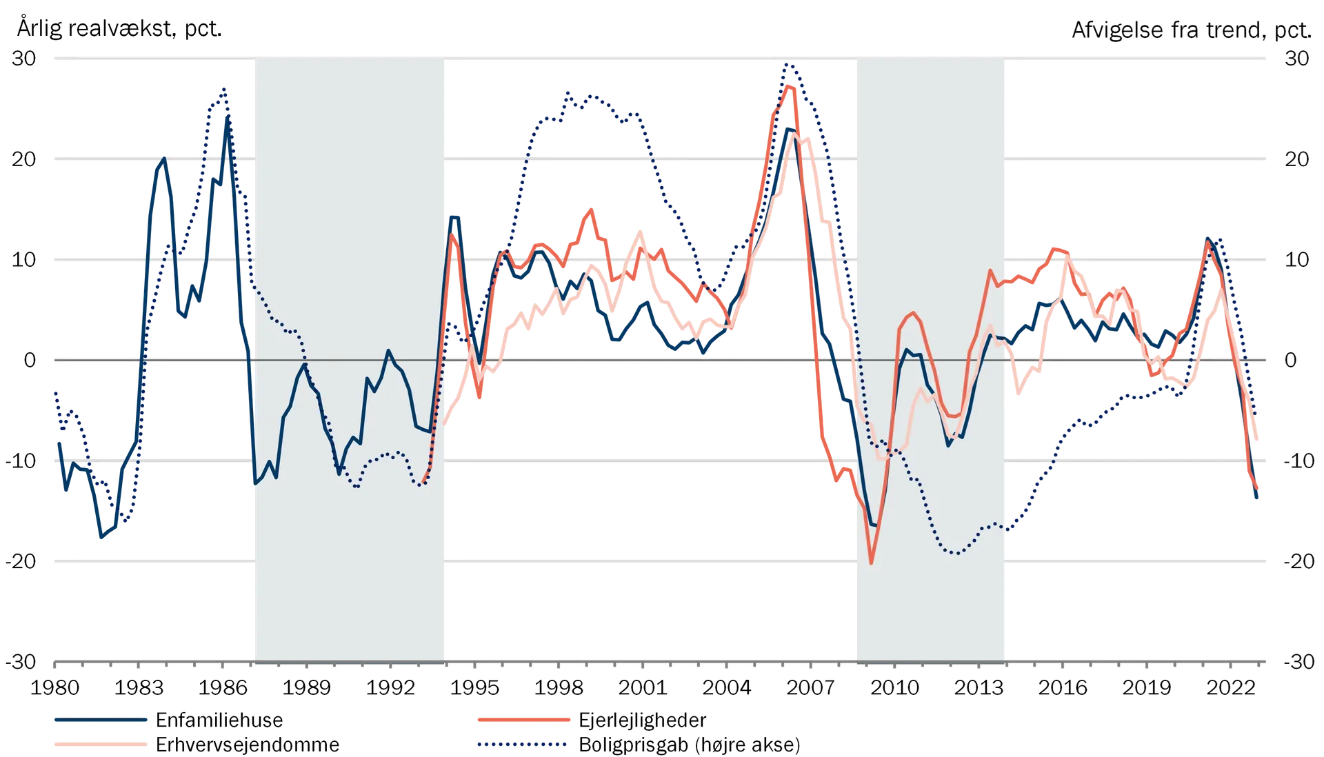 [21] Sammenvejet ud fra en principal komponent analyse, se tabel A.1. Andre variable som fx renter, aktieindeks, handelsbalancen, den effektive valutakurs mv. er ikke inkluderet, da de ikke indeholder lange cykler og ikke tenderer til at samvariere med boligpriser og kredit, se Grinderslev mfl. (2017).