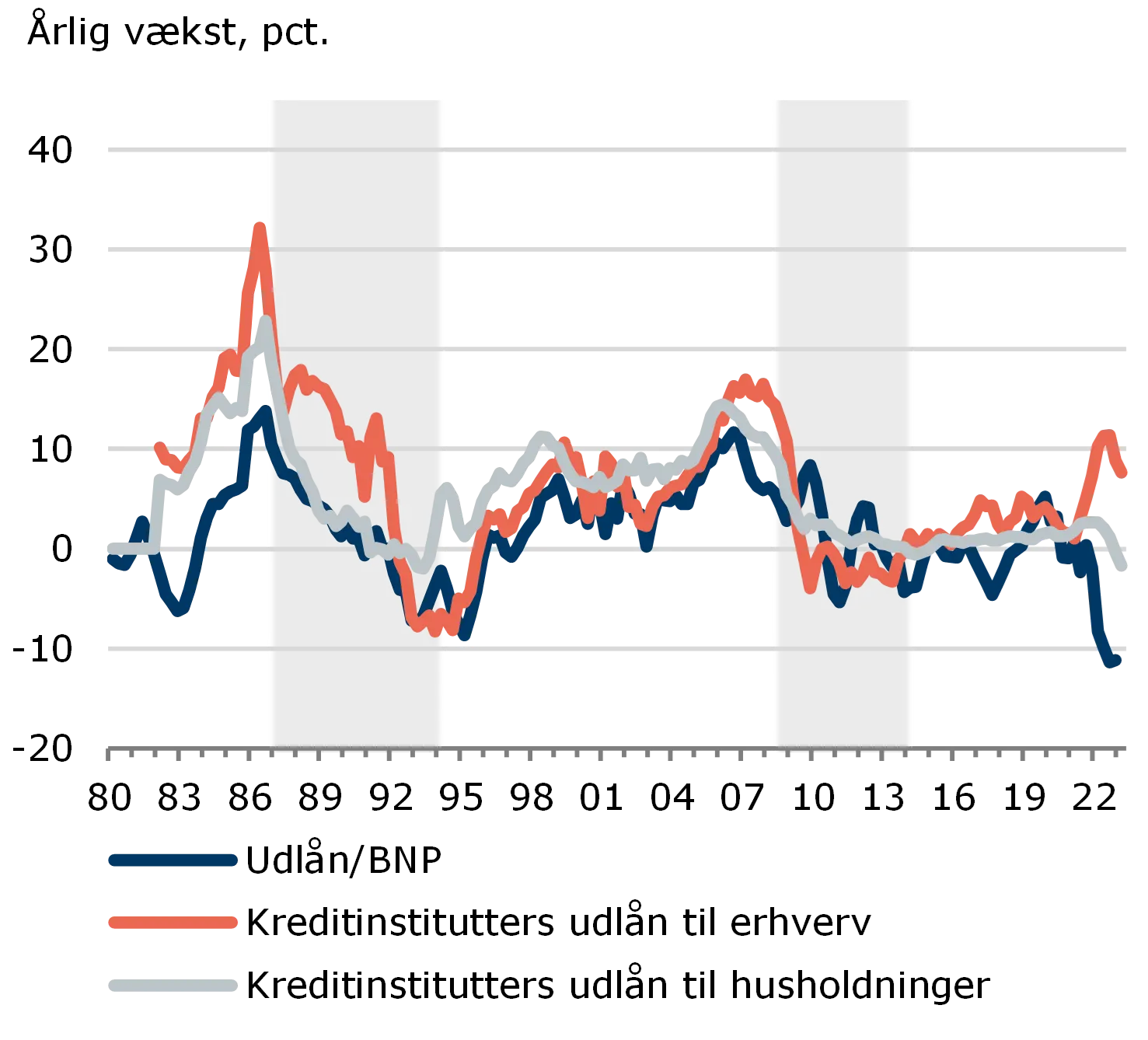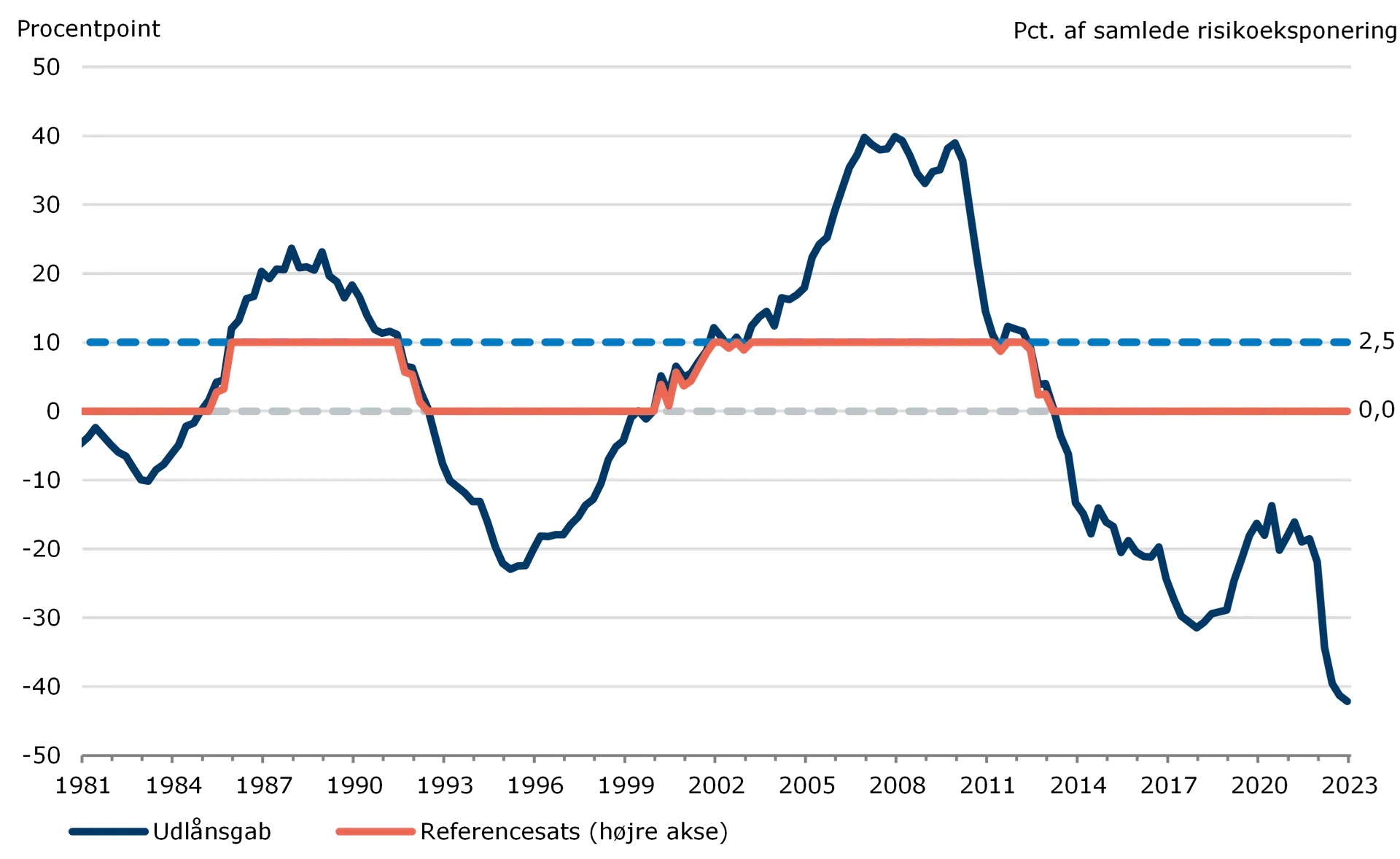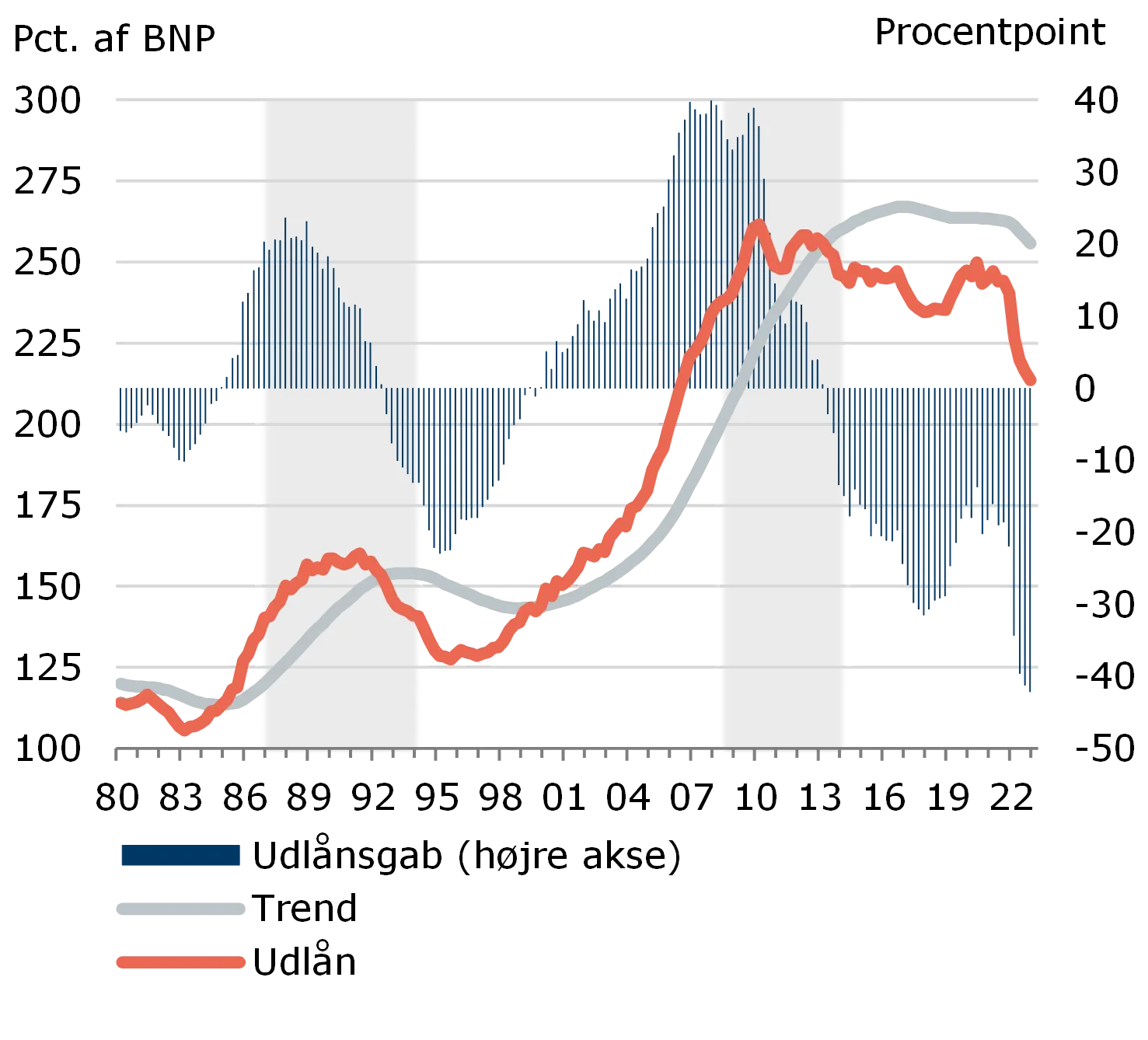 Udlånsgabet er en indikator for overdreven kreditgivning, hvor det samlede udlån vokser hurtigere end den generelle økonomiske udvikling og de underliggende strukturelle forhold. De strukturelle forhold kan dog ikke umiddelbart observeres og udvikler sig over tid. I praksis approksimeres det strukturelle niveau med en trend. Afvigelser mellem det faktiske udlån som andel af BNP (udlån/BNP) og trenden kaldes udlånsgabet. Indikatoren har historisk været god til at forudsige systemiske bankkriser på tværs af en række lande.[25] Udlånsgabet, og den tilhørende referencesats, har derfor en central rolle i internationale anbefalinger og lovgivning om den kontracykliske kapitalbuffer, jf. boks C.1 og bilag D.
