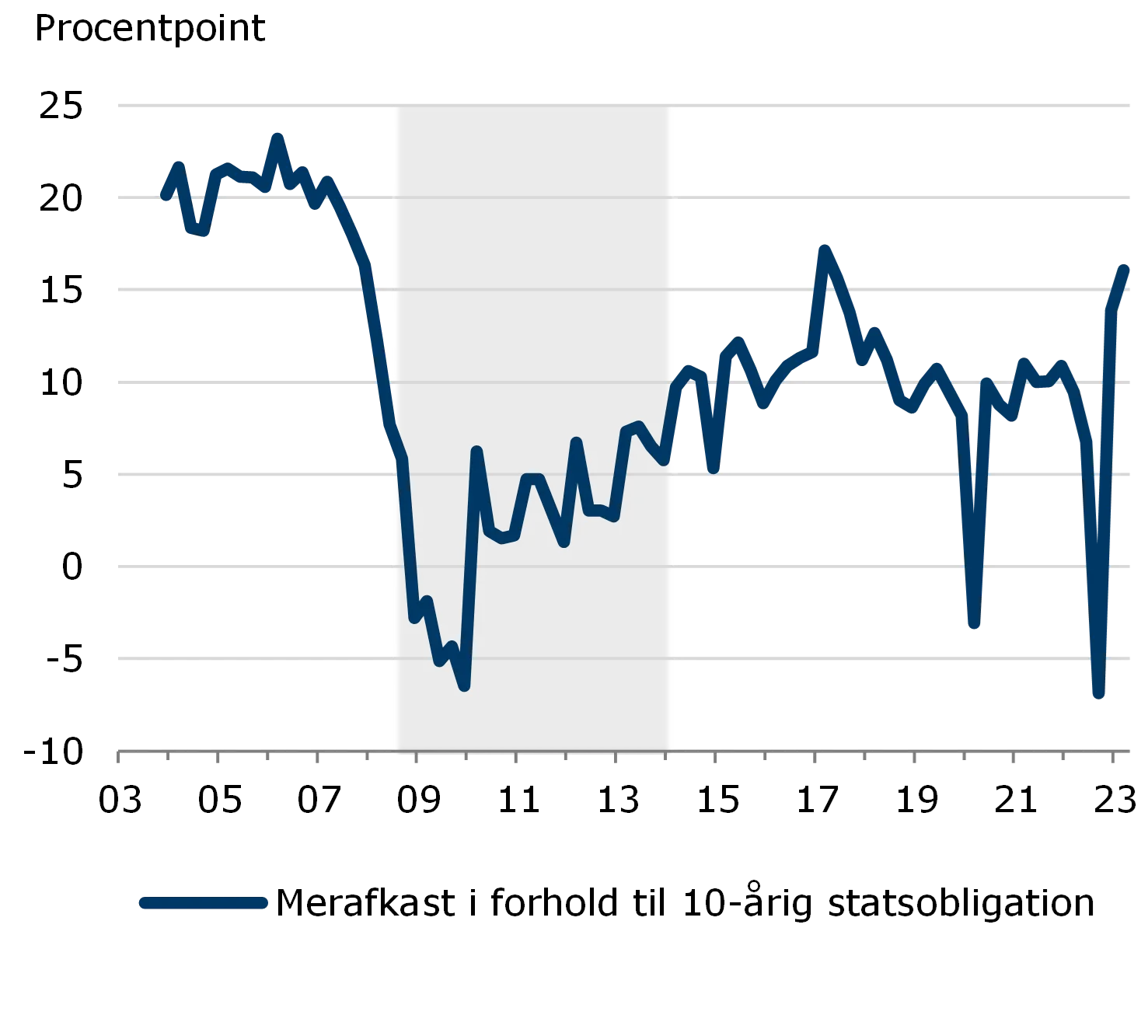 Pengeinstitutternes egenkapitalforrentning (vægtet gennemsnit) fratrukket den aktuelle 10-årige statsobligationsrente. Den aktuelle 10-årige statsobligationsrente skal approksimere det risikofrie afkast, som kan opnås over en længere periode. Indtjeningen er høj i gode tider, mens øgede nedskrivninger og tab reducerer indtjeningen i krisetider. |