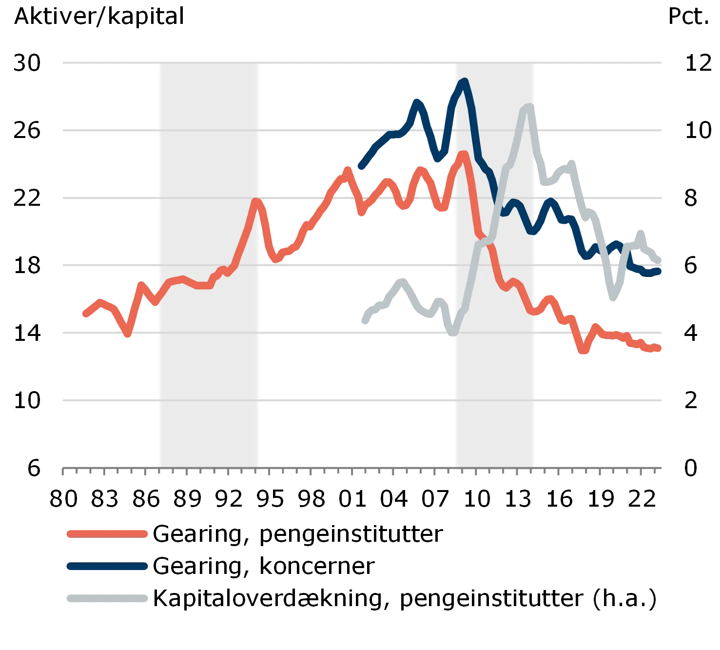 Frem til 2006 er kapitaloverdækningen beregnet som basiskapital fratrukket det individuelle solvensbehov (solvensbehovet er sat til 8 pct. før 2005). Fra 2007 er kapitaloverdækningen beregnet som den faktiske egentlige kernekapital fratrukket det samlede krav til den egentlige kernekapital (inkl. kapitalbuffere). Vægtet gennemsnit (for hele perioden). I 2008 begyndte de fleste systemiske institutter at anvende interne modeller til at opgøre deres kreditrisici, hvilket gav anledning til et fald i den gennemsnitlige risikovægt, jf. Danmarks Nationalbank (2016). |