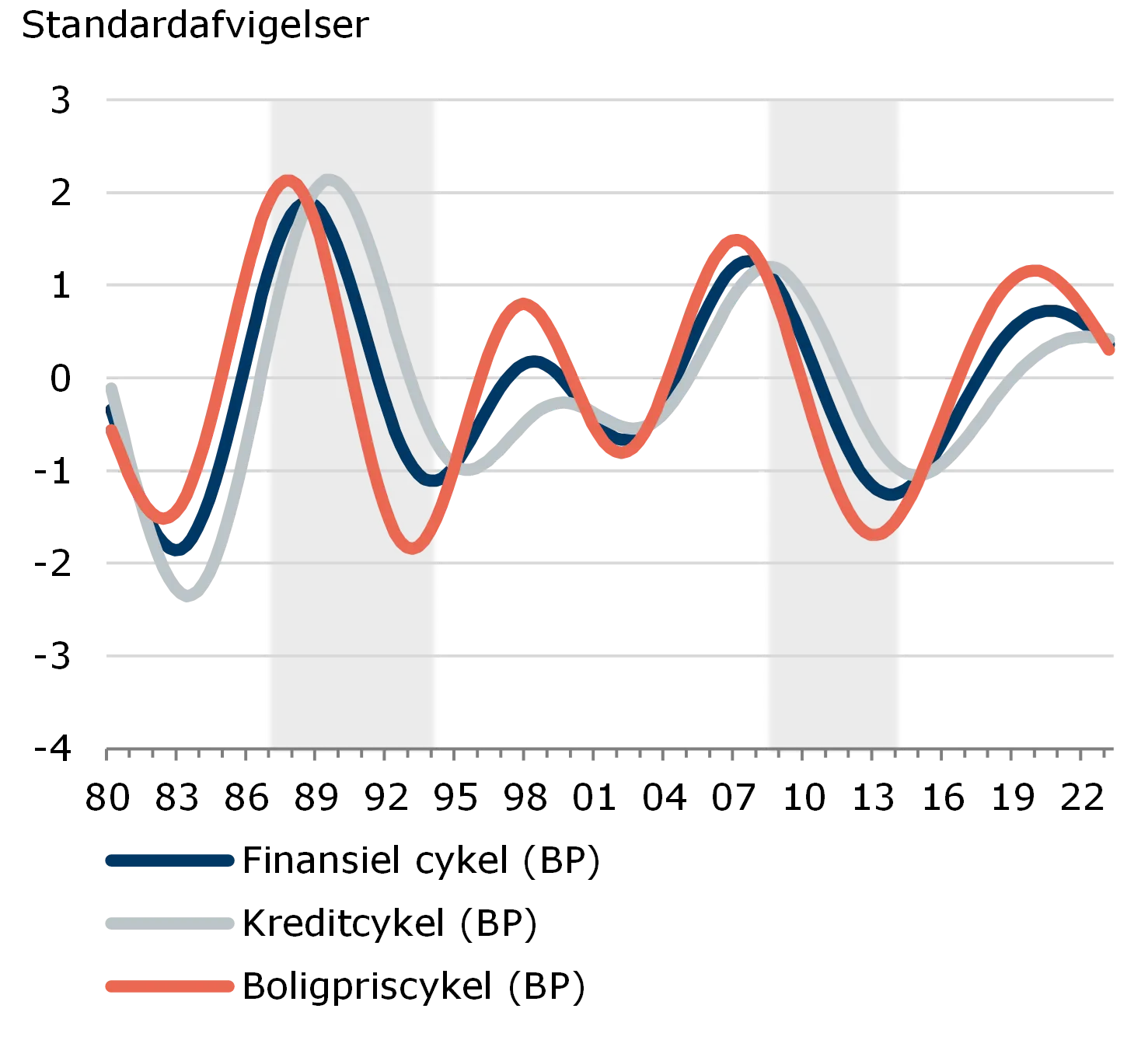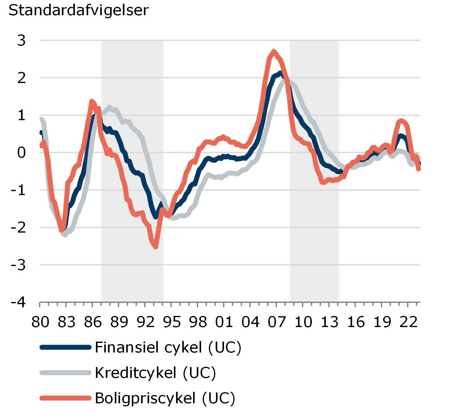 De estimerede finansielle cykler er baseret på den brede kreditdefinition (som udlån/BNP og udlånsgabet oven for) samt boligpriser og måles i afvigelser fra en trend. Cyklerne er estimeret ved brug af en "unobserved components"-model og et "band-pass"-filter. De underliggende serier er deflateret med BNP-deflatoren og standardiserede, før den samlede finansielle cykel er beregnet ved hjælp af en principal komponent analyse. Som følge af standardiseringen kan værdien af cyklen ikke tillægges en fortolkning, men afspejler hvilken fase, cyklen er i. |