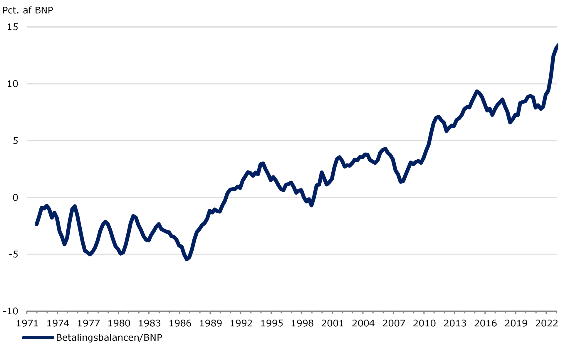 | Note: Betalingsbalancen/BNP er vist som et 4 kvartalers glidende gennemsnit. Kilde: Danmarks Statistik. |