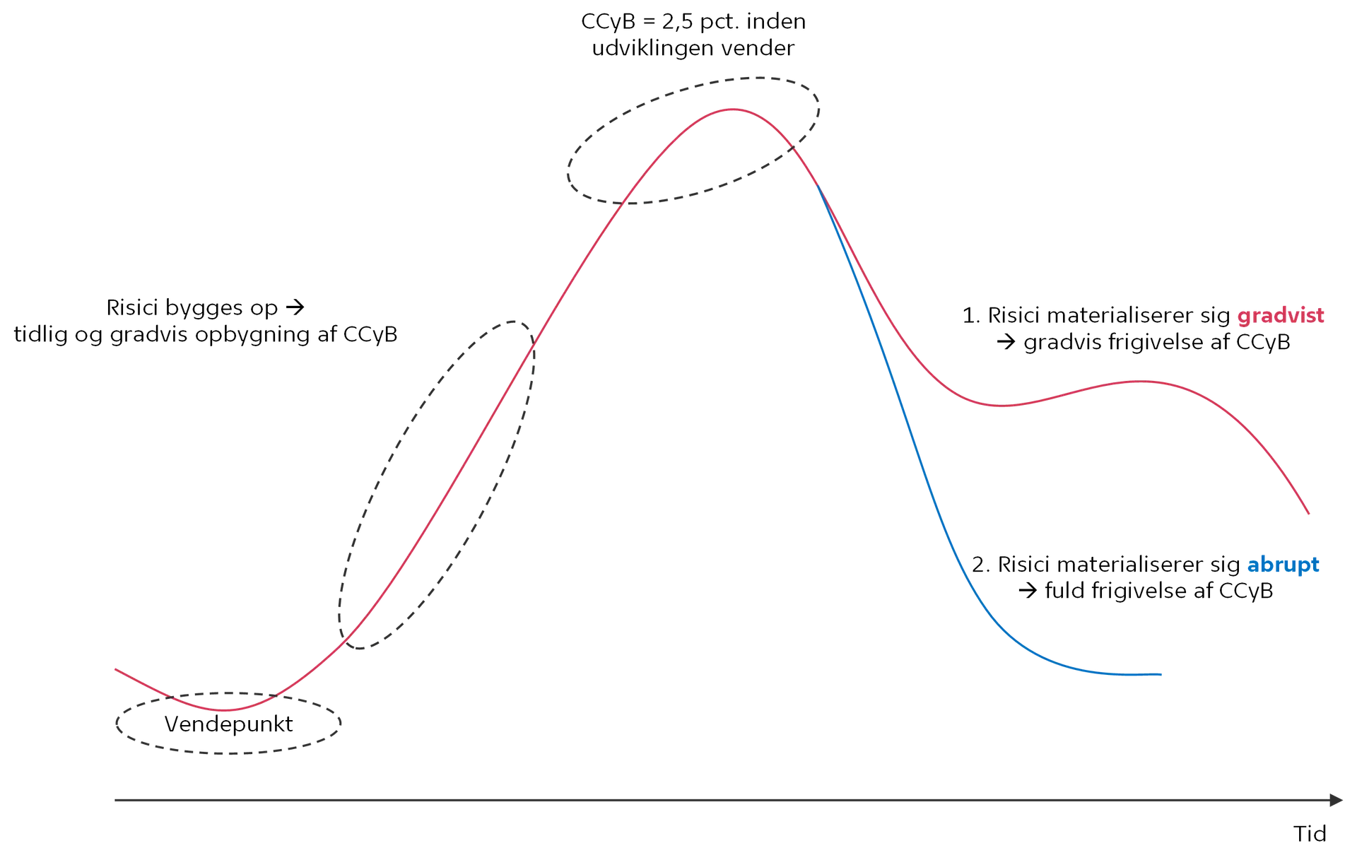 De to situationer er illustreret i figur 3. I den situation, hvor de identificerede risici aftager langsomt, uden at der er en krise, kan bufferen frigives gradvist. Bufferen vil formentlig blive frigivet på én gang i den anden situation. Det skyldes, at perioder med finansiel stress kan gå forud for systemiske kriser, som det sås i forbindelse med den seneste finansielle krise.