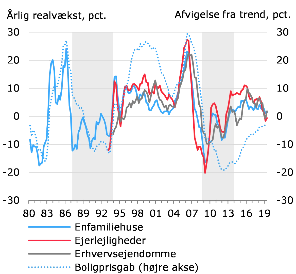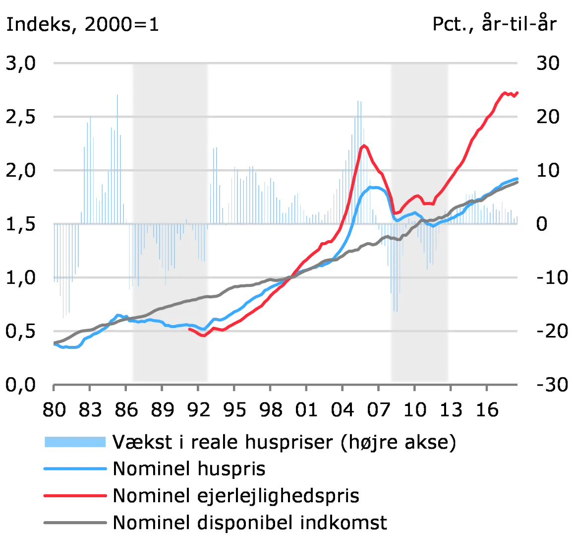 Dansk økonomi er fortsat i fremgang, og aktivpriserne er generelt høje. Priserne på både bolig- og erhvervsejendomsmarkedet er steget i flere år, men der er sket en udfladning siden medio 2018. Priserne på enfamiliehuse stiger fortsat moderat. For ejerlejligheder er priserne bremset op og handelsaktiviteten aftaget. Prisniveauet i København er imidlertid fortsat højt og understøttes af det meget lave renteniveau.