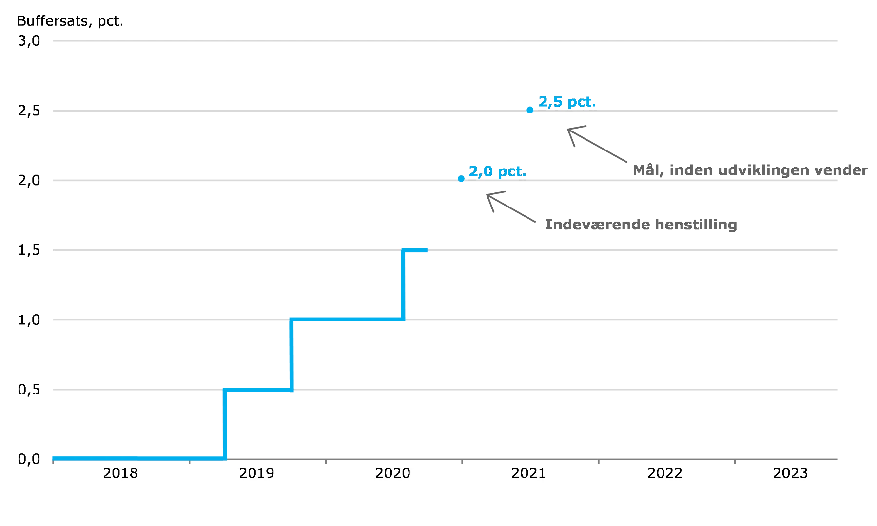 Bufferen skal have en vis størrelse for at kunne gøre en forskel, når der på et tidspunkt opstår et behov for at frigive den. Det er derfor Rådets holdning, at bufferen skal bygges op til 2,5 pct., medmindre der sker en væsentlig opbremsning af risikoopbygningen i det finansielle system. Den gradvise opbygning af bufferen er illustreret i figur 1.