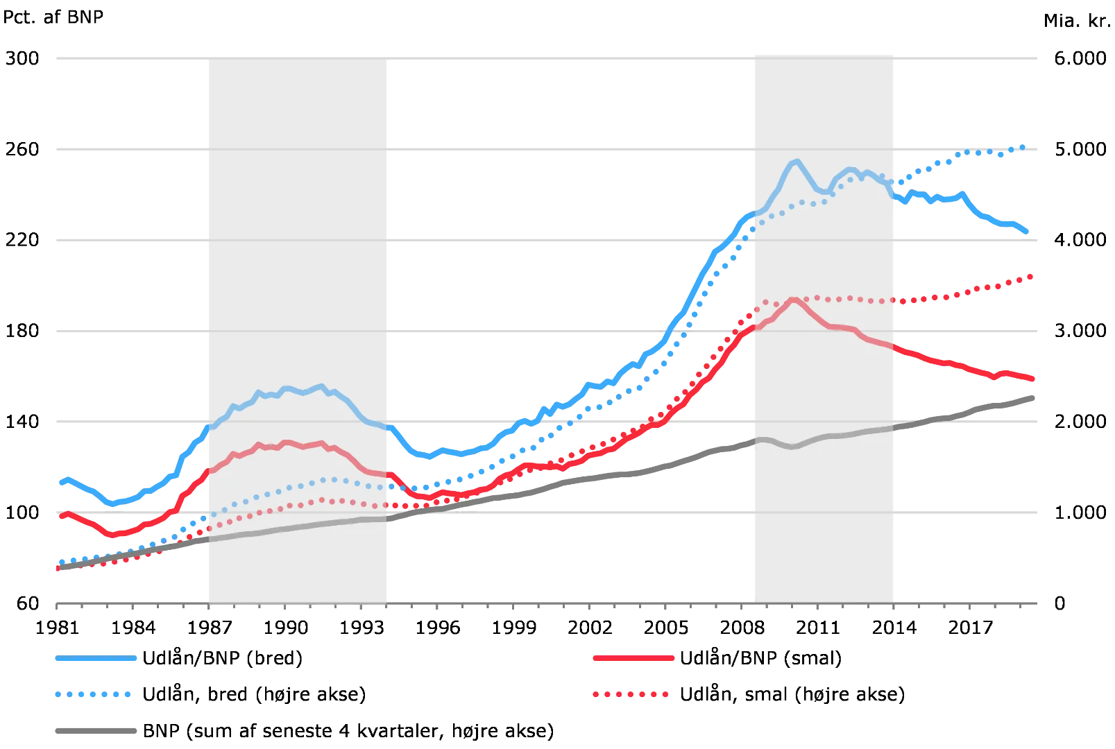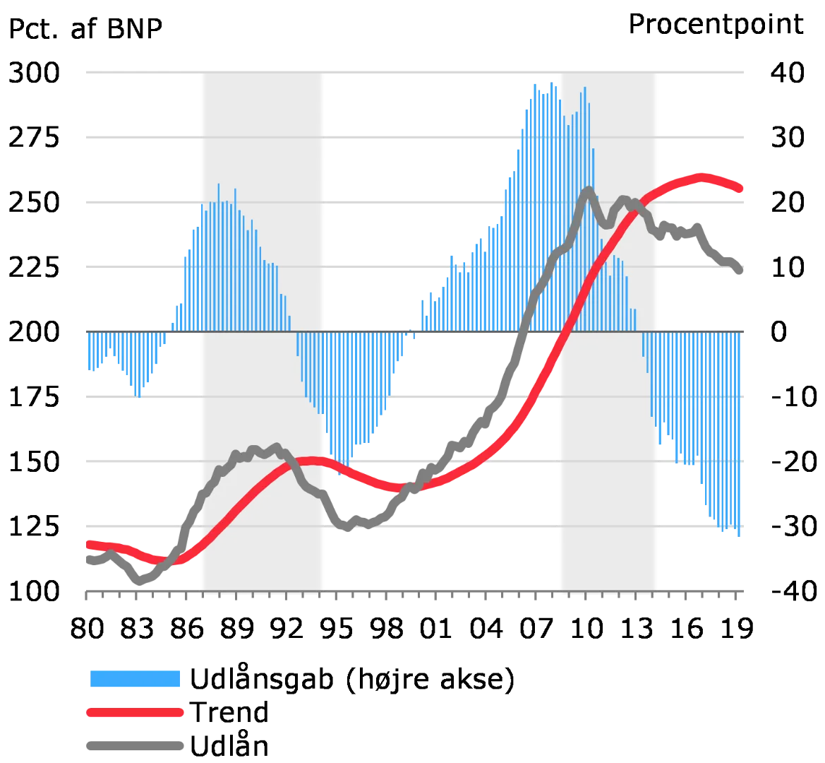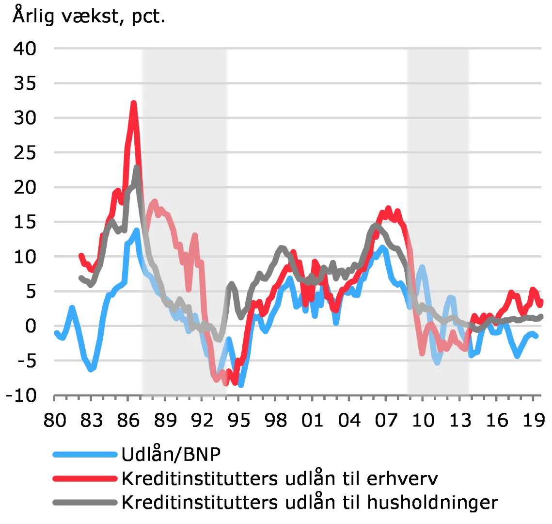 Den lange periode med lave renter og lempelige finansielle forhold danner i kombination med konjunkturfremgangen grobund for en fortsat opbygning af kreditrisici. Risici forstærkes af, at det samlede udlån allerede er på et højt niveau.