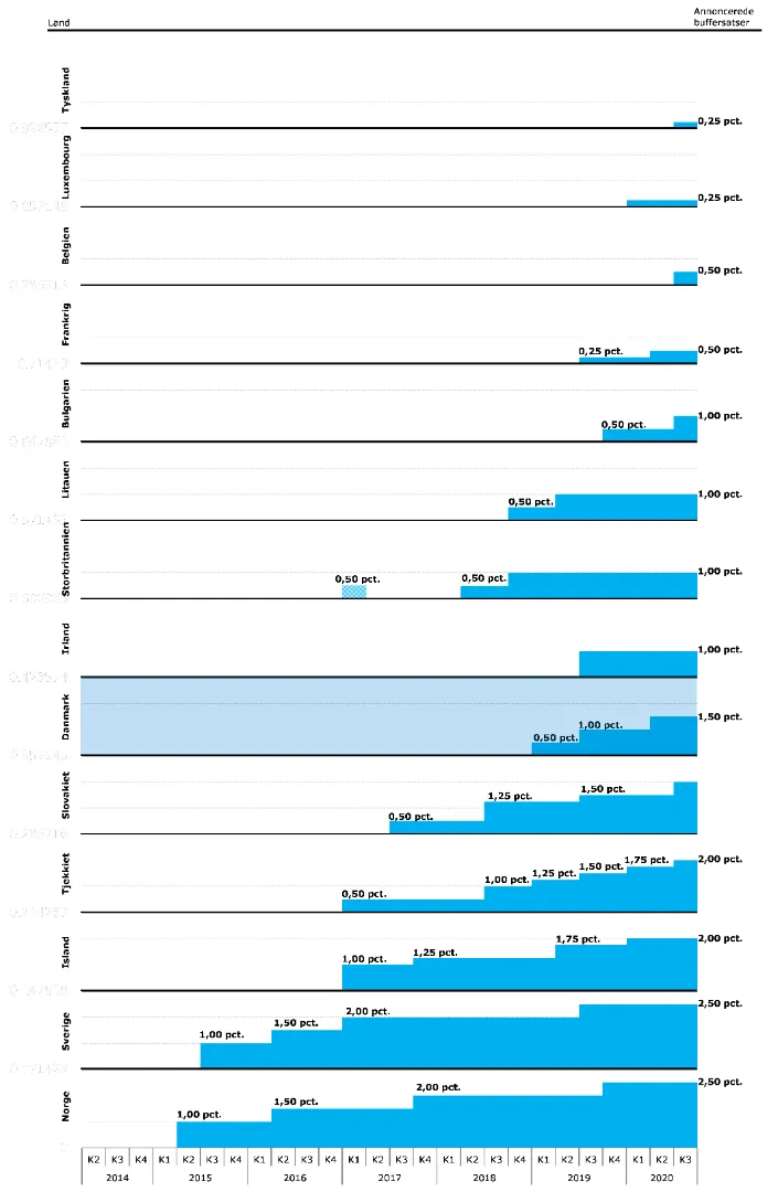Rådet inddrager også andre politiktiltag i sine overvejelser om den kontracykliske buffersats, herunder indfasning af kommende krav til institutterne. Langt hovedparten af de danske institutter havde medio 2019 tilstrækkelig kapital til at opfylde de bufferkrav[6], der er indfaset frem mod 2019, samt en kontracyklisk kapitalbuffer på 2,0 pct. i Danmark. Den kontracykliske kapitalbuffer adskiller sig fra andre bufferkrav, idet den kan lempes ved finansielt stress, mens de andre krav gælder i såvel op- som nedgangstider.