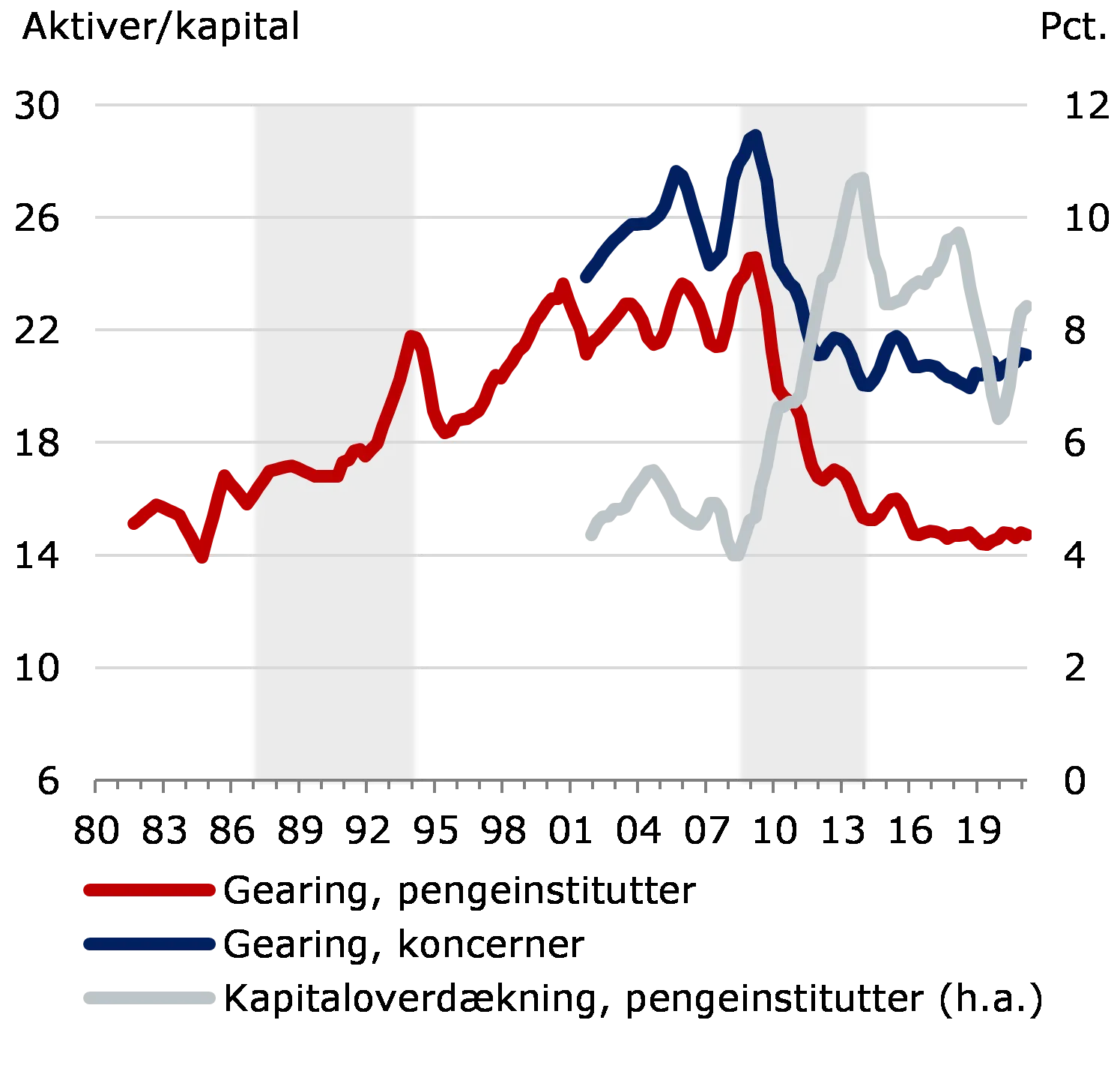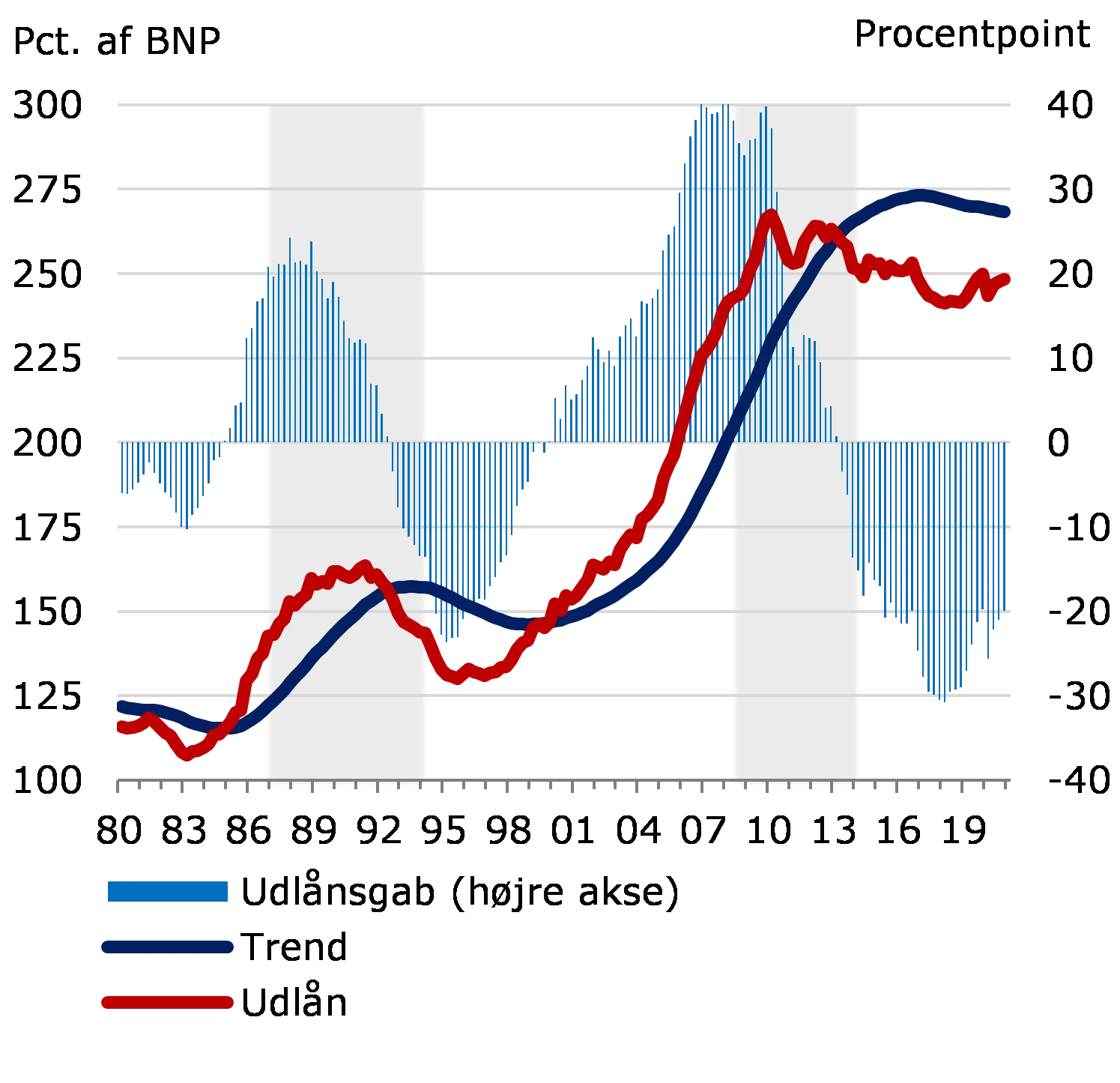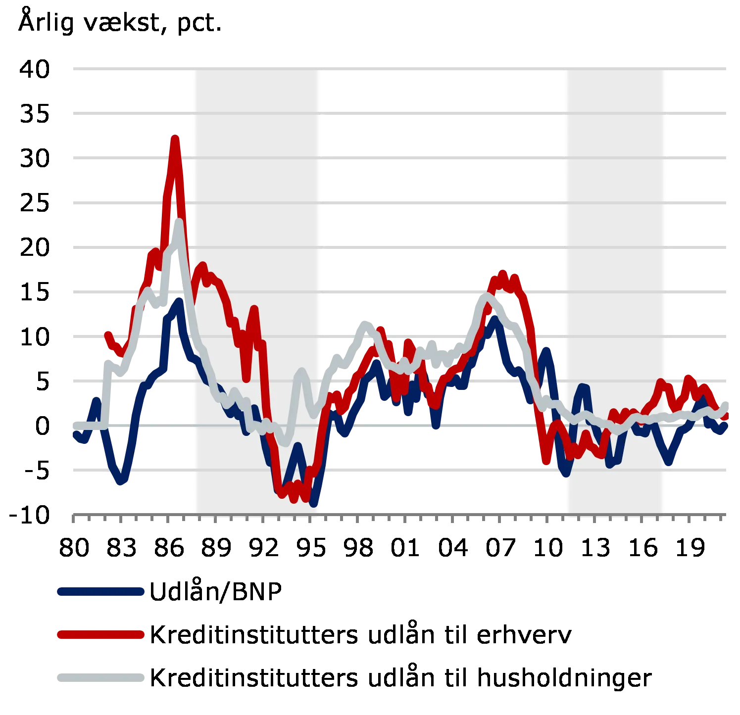 Selv om kreditvæksten har været afdæmpet, som konsekvens af de statslige hjælpepakker til erhvervslivet, kan den forventes at tage til i forbindelse med udfasningen af hjælpepakkerne. Udlånet til husholdningerne er dog fortsat steget i det seneste år, og efterspørgslen efter lån er taget til i begyndelsen af 2021 i takt med den stigende aktivitet på boligmarkedet. Selv hvis kreditvæksten forbliver moderat forstærkes risici af, at udlånet allerede er på et højt niveau.