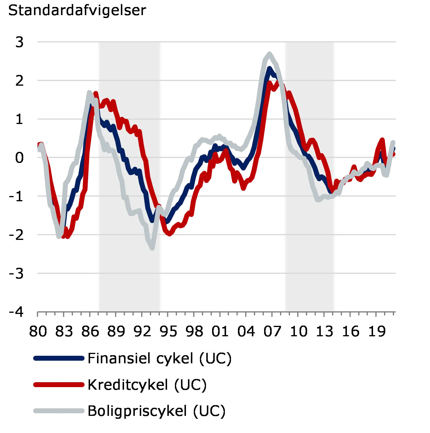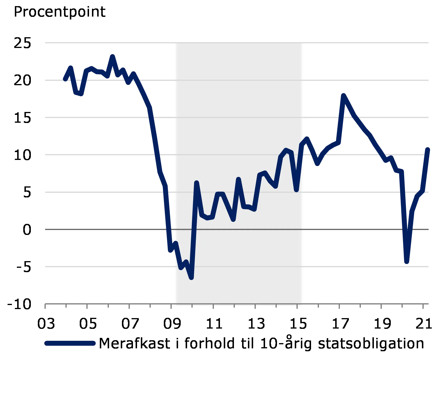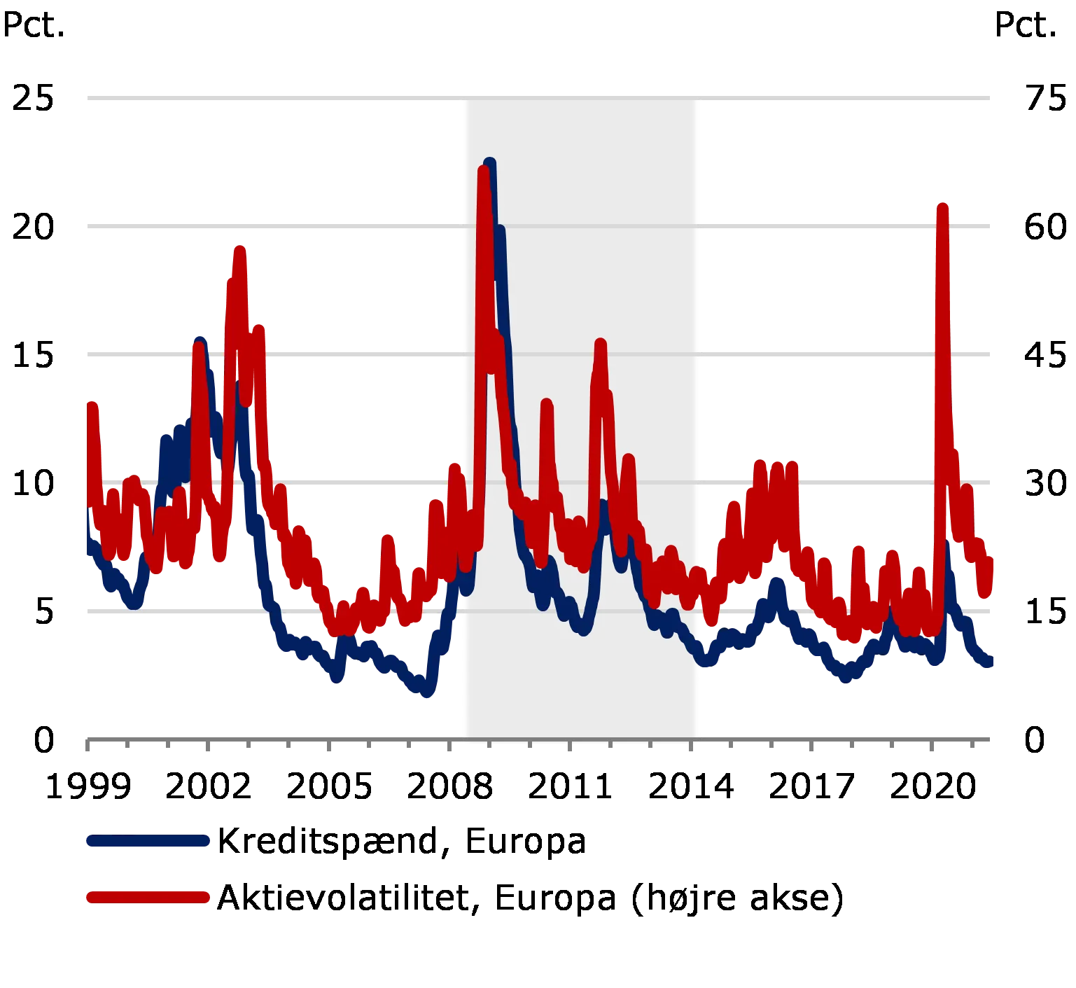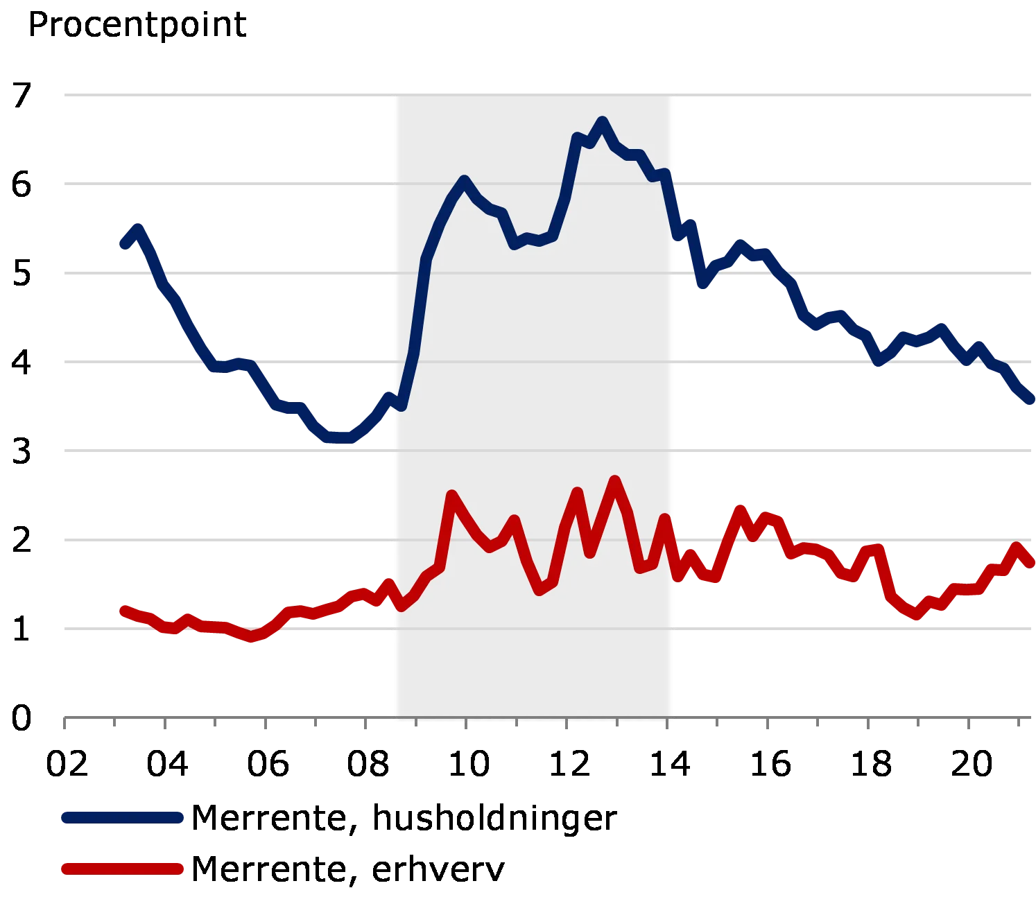 Selv om kreditvæksten har været afdæmpet, som konsekvens af de statslige hjælpepakker til erhvervslivet, kan den forventes at tage til i forbindelse med udfasningen af hjælpepakkerne. Udlånet til husholdningerne er dog fortsat steget i det seneste år, og efterspørgslen efter lån er taget til i begyndelsen af 2021 i takt med den stigende aktivitet på boligmarkedet. Selv hvis kreditvæksten forbliver moderat forstærkes risici af, at udlånet allerede er på et højt niveau.