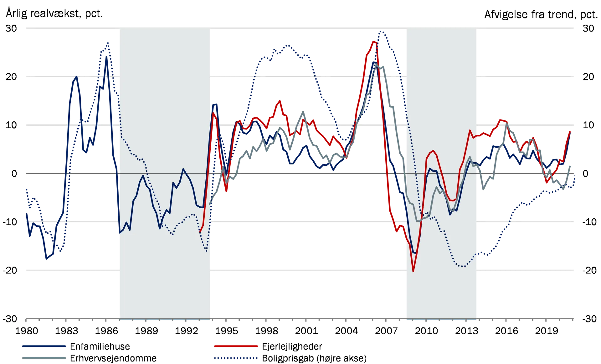 Dansk økonomi er i genopretning. Selv om nogle brancher stadig er ramt af nedlukninger, er andre brancher i kraftig fremgang. Den samlede økonomiske aktivitet forventes at tage kraftigt til i takt med, at nedlukkede brancher genåbnes, og befolkningen vaccineres. Danskernes opsparing er steget, mens covid-19-krisen har begrænset forbrugsmulighederne. Stigende aktie- og boligpriser har bidraget til stigende formuer. Udbetalingen af de sidste ugers feriepenge i løbet af foråret giver yderligere afsæt for, at aktiviteten kan tage til i boligmarkedet eller i de brancher, som genåbnes.