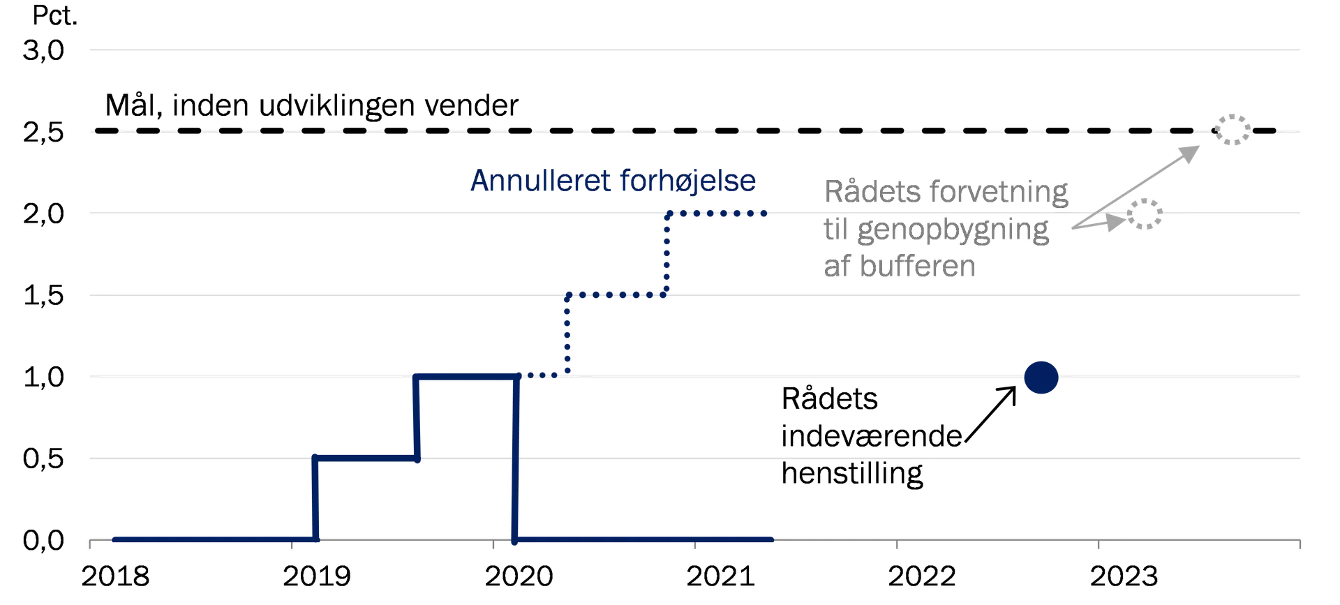 | Note: Den viste buffersats er den aktuelle, som kreditinstitutterne skal efterleve. Punktet i 2022 viser tidspunktet, hvor kreditinstitutterne tidligst vil skulle efterleve en højere buffersats, jf. Rådets henstilling. Kilde: Danmarks Nationalbank. |