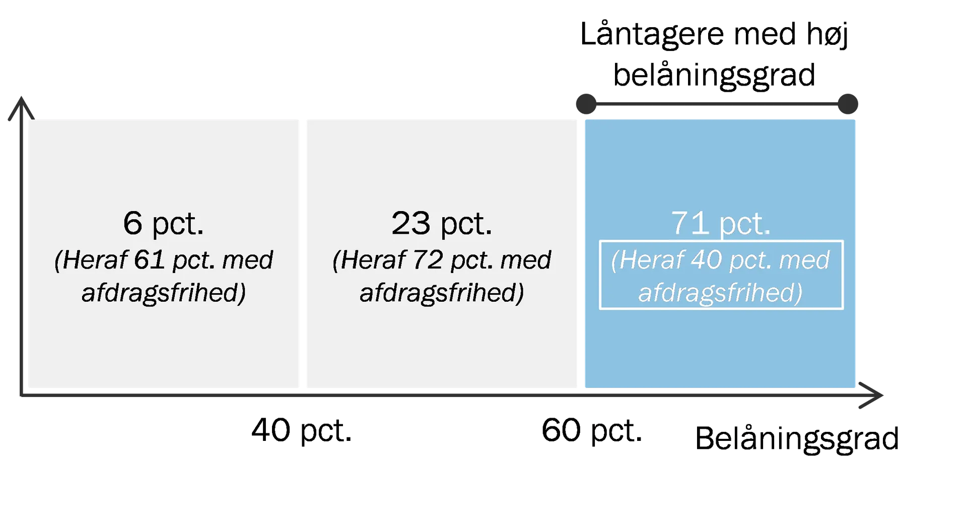 Der er en betydelig udbredelse af afdragsfrie lån i Danmark, også blandt højt belånte boligejere, jf. figur 1. De lempelige muligheder for optagelse af lån med afdragsfrihed øger risikoen for, at boligejere gældsætter sig uforholdsmæssigt højt. Afdragsfrihed giver i kombination med det lave renteniveau mulighed for at optage stor gæld modsvaret af en meget lav ydelse. Når mange boligejere er højt gældsat, øger det risikoen for sammenfaldende tab ved negative økonomiske stød, der kan ramme dansk økonomi. Den store udbredelse giver negative eksternaliteter på makroniveau og opbygger dermed systemiske risici.